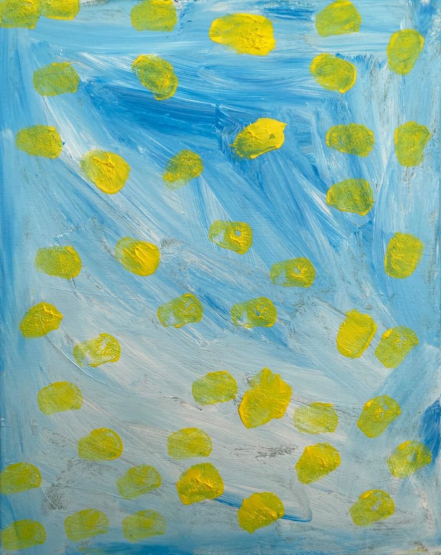 This original abstract painting is created with acrylic on canvas, measuring 40 × 50 cm in a vertical rectangular format. The composition features expressive blue brushstrokes layered in soft, sweeping motions, creating movement and depth across the surface. Vibrant yellow textured forms are scattered throughout, adding contrast, rhythm, and a lively visual energy.